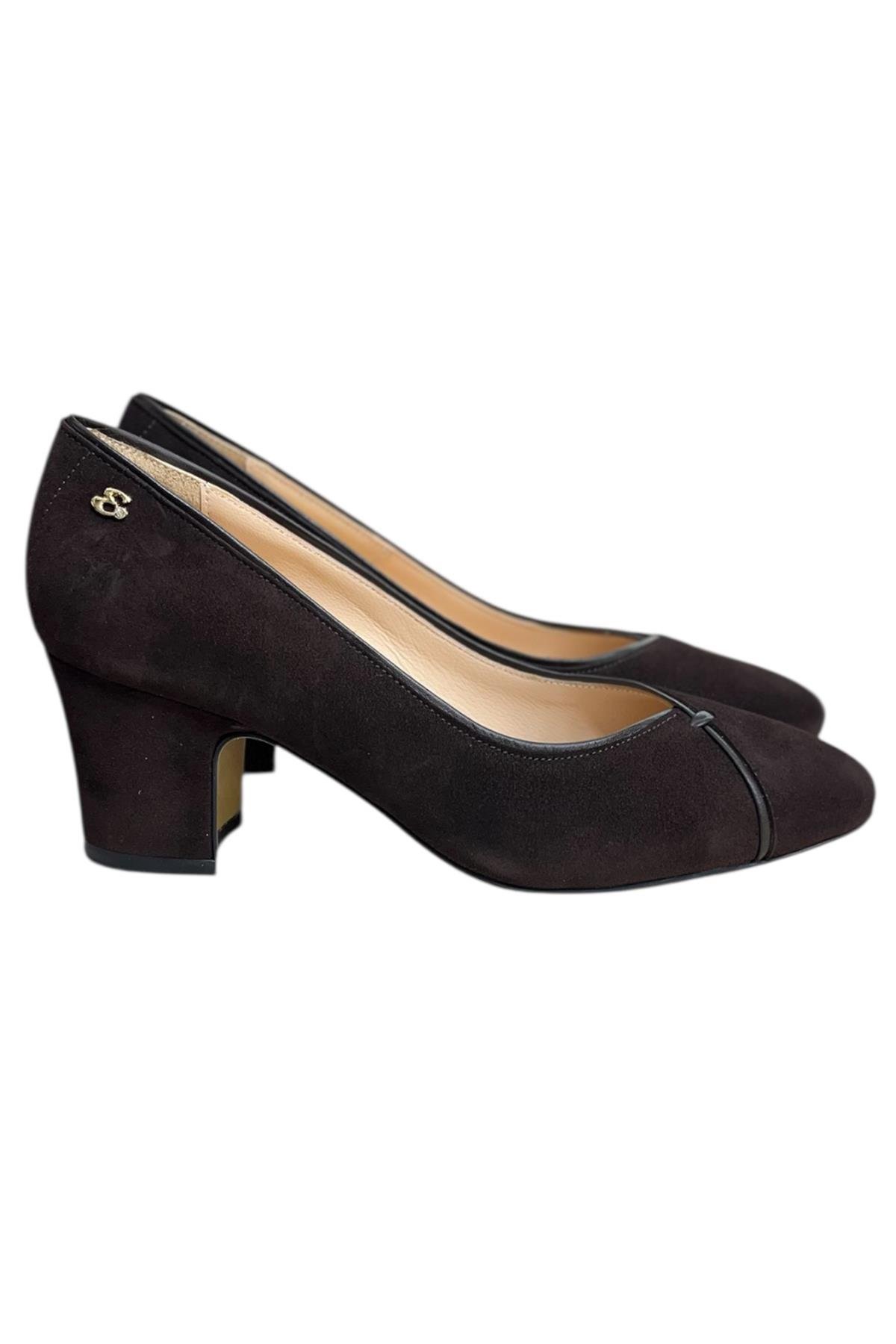 Kahve Hakiki Deri Süet Biye Detay Topuklu Ayakkabı