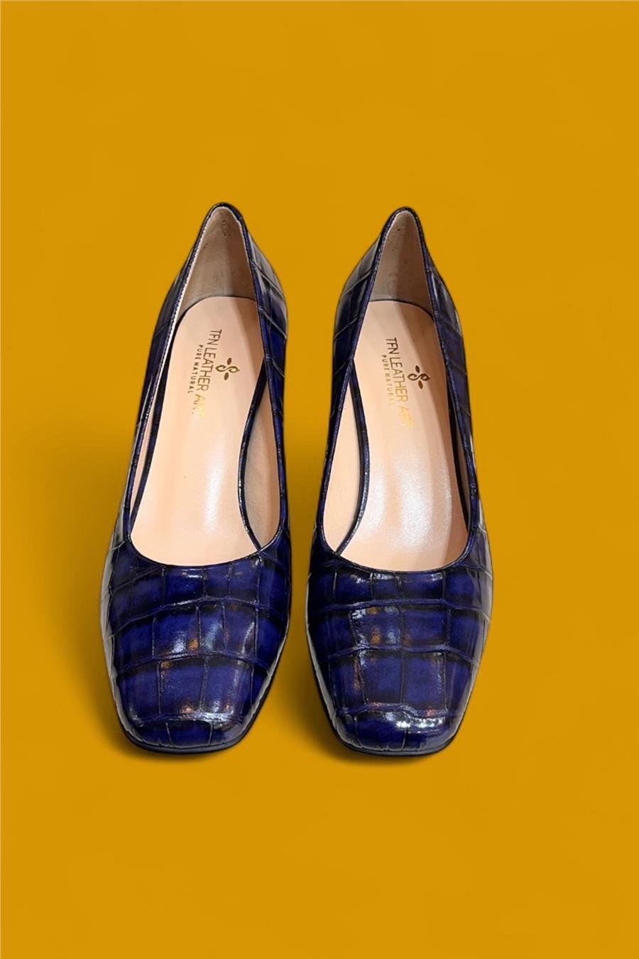 Lacivert  Krokodil Hakiki Deri Topuklu Ayakkabı